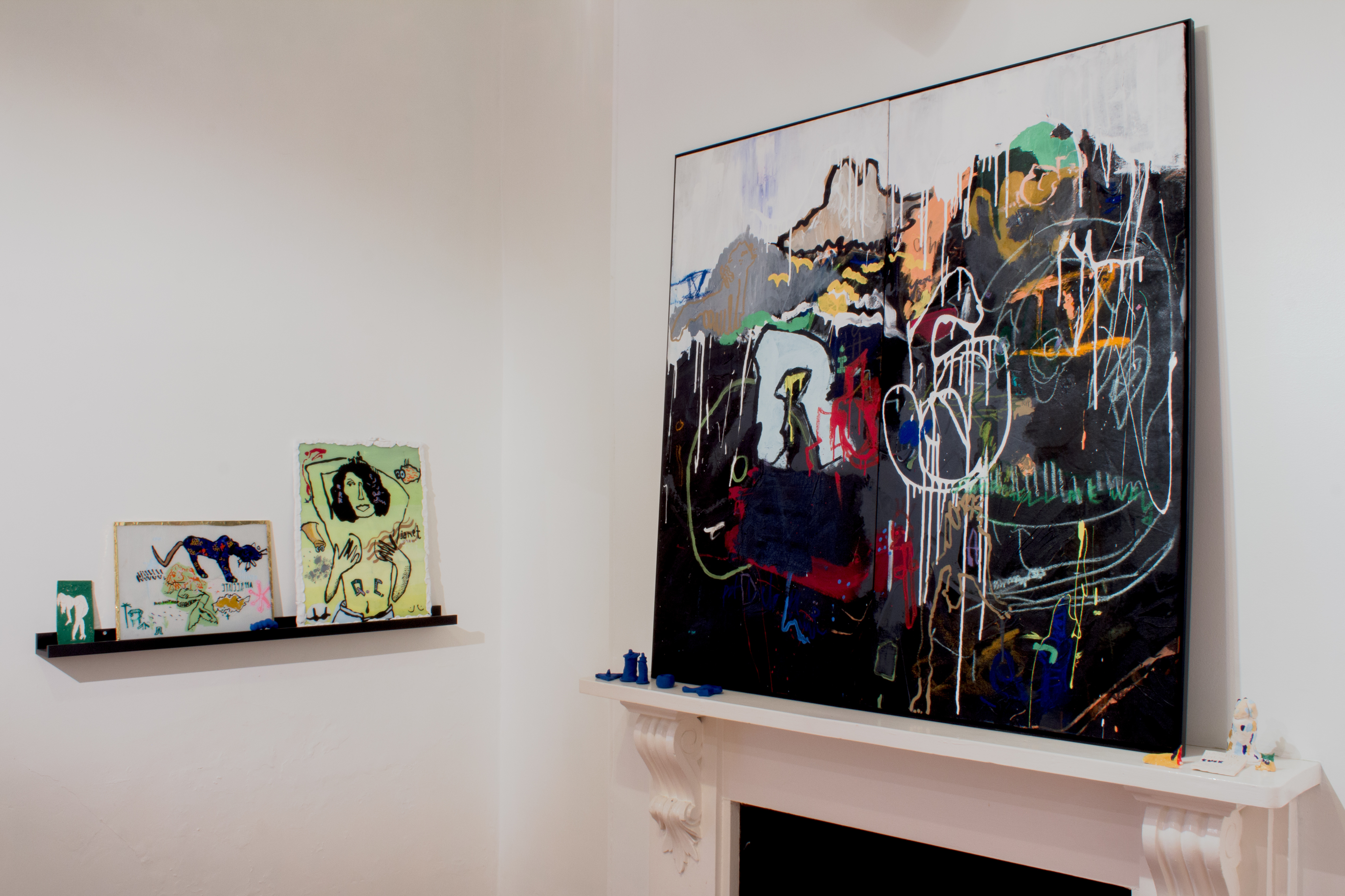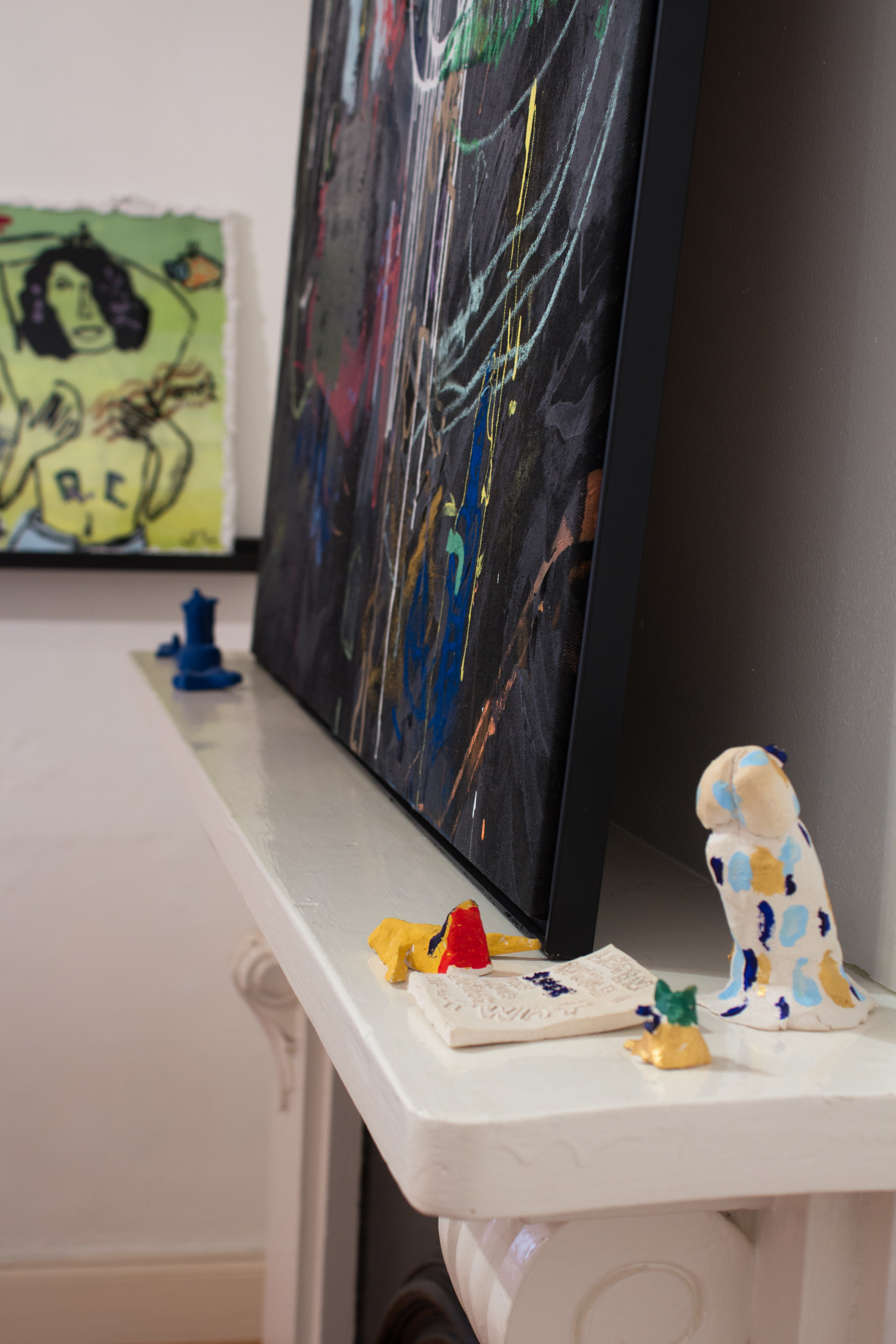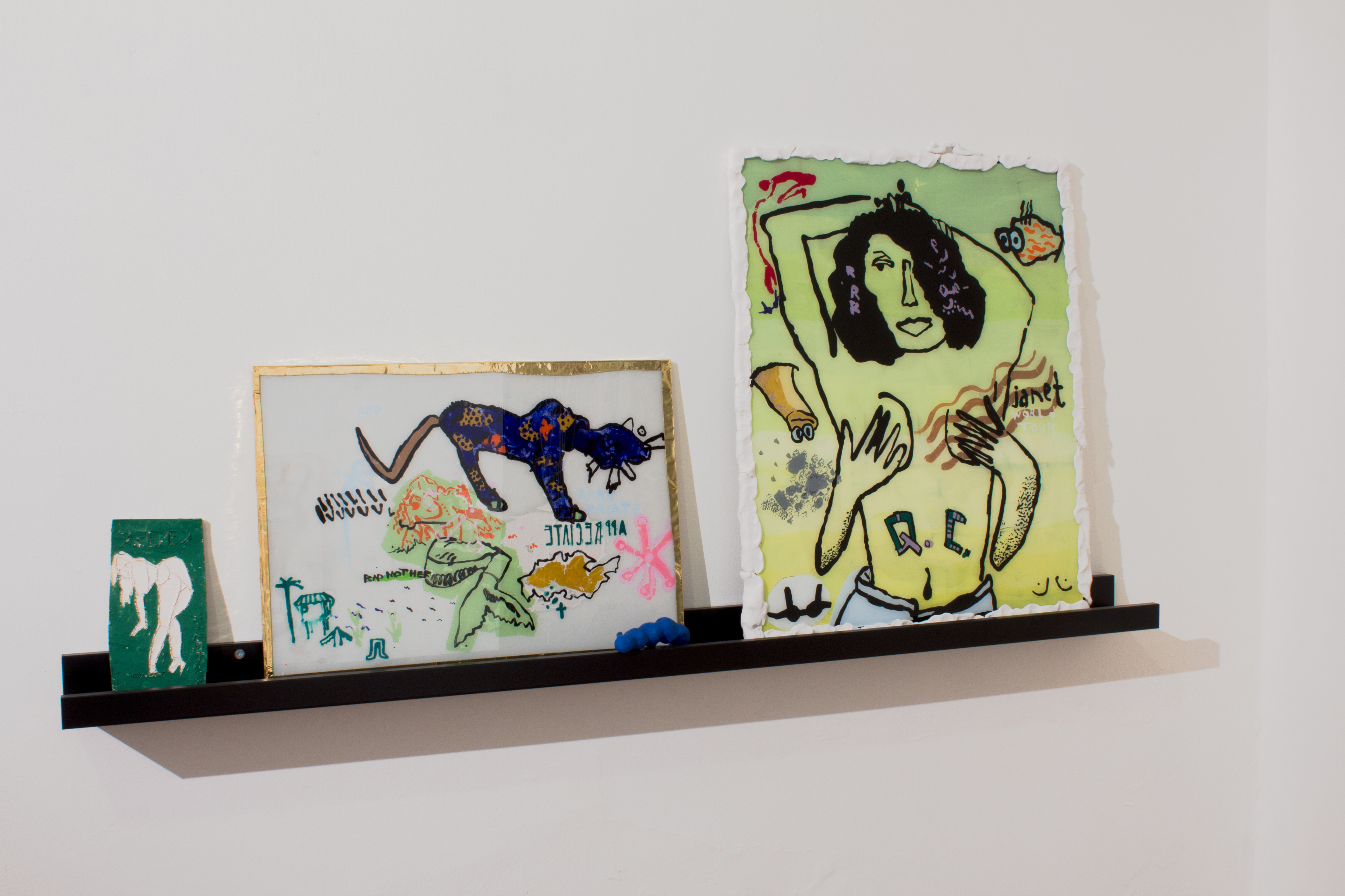 Installation view of (L-R) clay artwork, Island of the Aswang, Janet Jackson World Tour and Christopher