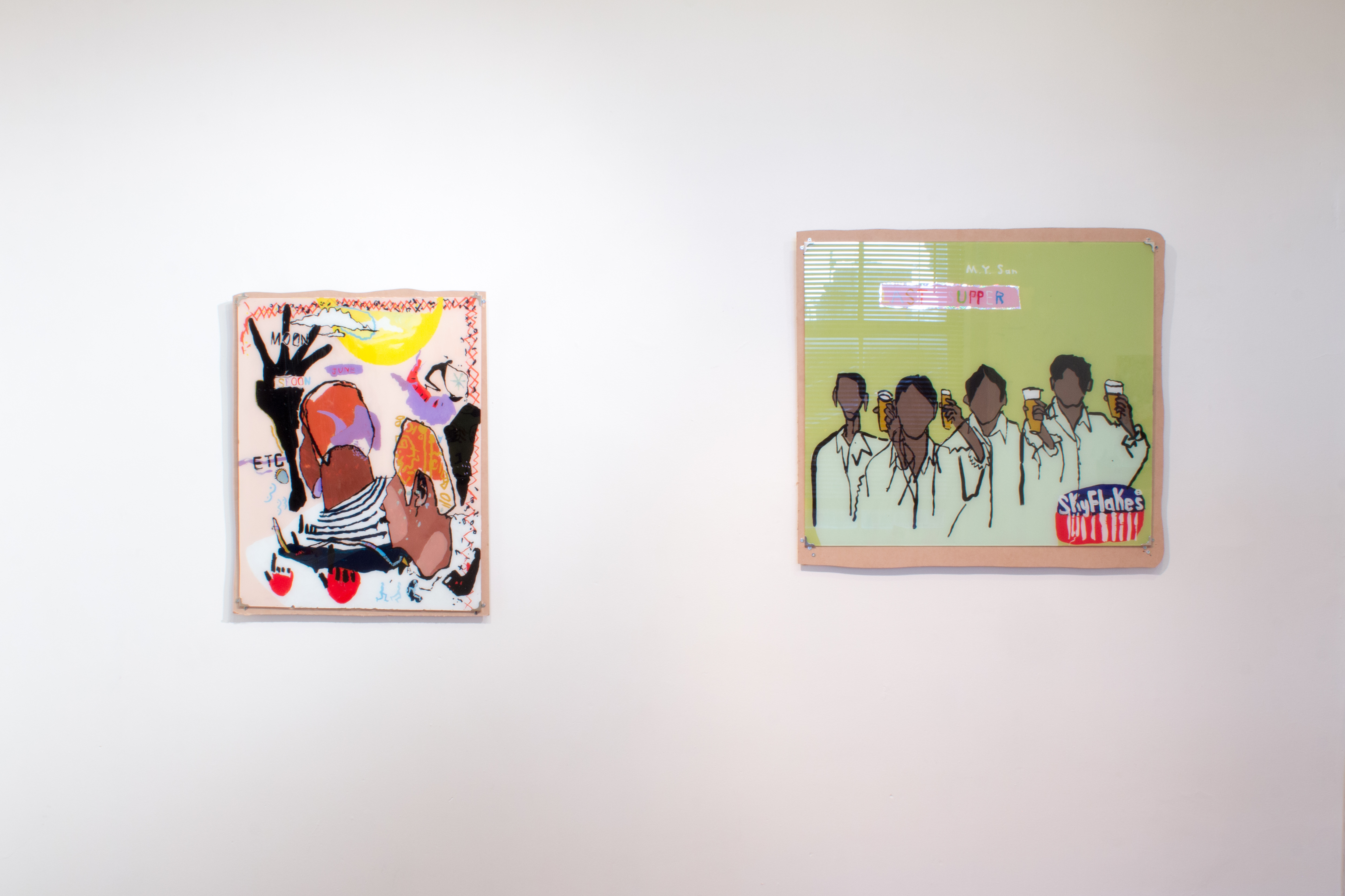 Installation view of (L-R, top row) 3210, Crumblin Erb, Something...Something...World Peace (L-R, bottom row) Real Recognise Real, Kiss Tradition Good-buy, Ladies,Speak English
